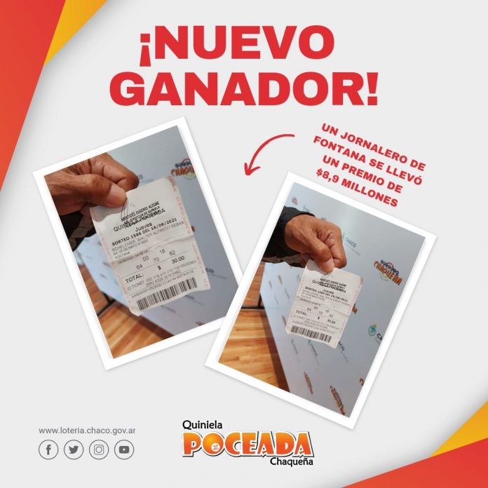 Locales | Un jornalero de Fontana pasó en la mañana del miércoles por las oficinas de Lotería Chaqueña para hacer efectivo el premio de casi 9 millones de pesos, que obtuvo durante el sorteo de la Quiniela Poceada Chaqueña del pasado jueves 16 de septiembre.