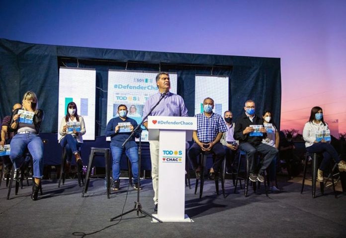 Locales | El gobernador Jorge Capitanich encabezó este sábado 28 de agosto un nuevo acto de campaña del Frente de Todos Chaco en Sáenz Peña. Renovó su compromiso para la construcción y mejora de redes de agua potable y cloacas, más pavimento urbano, viviendas, el nuevo autódromo y más infraestructura escolar. Pidió a la militancia fortalecer el compromiso para llevar el mensaje del Frente de Todos.