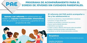 El programa PAE busca acompañar a los y las adolescentes sin cuidados parentales que residen en Espacios Convivenciales Alternativos, para que se desarrollen y alcancen sus metas y proyectos de vida, accediendo a sus derechos en igualdad de oportunidades una vez que egresen.