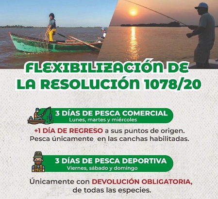 Lunes, martes y miércoles, más un día para el regreso, para pescadores comerciales y sólo en las canchas de pesca habilitadas. Viernes, sábado y domingo para deportivos; con devolución obligatoria de todas las especies, según lo establecido por la Secretaría de Desarrollo Territorial y Ambiente.